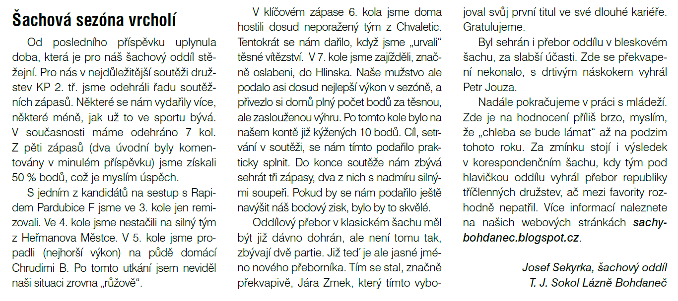 Redakce Zpravodaje Města Lázně Bohdaneč nám opět poskytla prostor k publikaci, tentokráte v březnovém čísle. Příspěvek se dotýká činnosti oddílu ve vrcholící sezóně. Pozitivně "laděný" příspěvek byl k dnešku poněkud "znehodnocen", když od doby zaslání k tisku se nám hrubě nevydařily dva soutěžní zápasy. Veřejnost budeme informovat a sezonu předpokládám zhodnotíme v květnovém čísle.