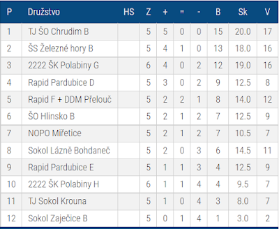 Nelze začít jinak - no konečně. Po bídných výkonech v minulých kolech jsme konečně podali výkon "hodný našeho jména". Rozdíl v průměru ELO bodů byl propastný v náš prospěch, ale ne zcela vypovídající. Až tak špatný soupeř nebyl. Zápas se od začátku pro nás vyvíjel příznivě a nakonec i tak skončil. Sled partií: V 10,54 hod. jsme bodovali na 5.š., v zahájení se sice černý "držel", pak ztratil materiál i partii. V 11,20 jsme si připsali další bod na 3.š., když černý v pasívní pozici neodolal tlaku bílého. 20 minut na to jsme již rozhodli o celkové výhře v zápase ziskem bodu na 2.š. Bílý záhy obětoval střelce za útok, ke kterému mu ho ale černý nepřipustil a převahu materiálu zužitkoval k výhře. Zbylé dvě partie se "zasekly". Ve 12,51 hod. skončila remízou partie na 4.š. Černý hrál od začátku dost pasivně, ale nakonec jezdcovou koncovku s pěšcem méně uhájil. Poslední partie na 1.š bylo drama. Bílý časovou tíseň, za starých časů by se dalo říci "s ležícím praporkem", ustál. Ve vzniklé věžové koncovce měl jistou poziční výhodu, zda by stačila k zisku bodu, těžko říci. Černý asi ale nehrál nejpřesněji a nakonec vzdal v beznadějné pozici ve 13,43 hod., čímž skončilo i celé utkání.
